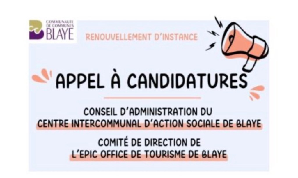 Dans le cadre du renouvellement de ses instances, la Communauté de Communes de Blaye lance un appel à candidatures en vue de la désignation des membres non élus du Conseil d’administration du Centre Intercommunal d’Action Sociale (CIAS) de Blaye et des membres professionnels du tourisme du territoire, du Comité de Direction de l’EPIC Office de Tourisme de Blaye. Les volontaires ont jusqu’au 06 avril 2026 pour candidater.
